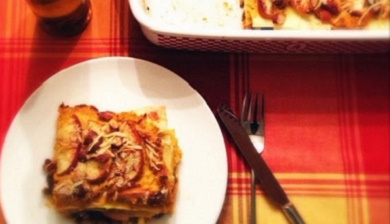 Beleg met 1/3 van de appel, rasp er kaas boven en dek af met 4 lasagnebladen. Maak dan nog zo’n laag, dek af met de rest van de lasagne en verdeel de rest van de pompoenpuree, de amandelen en de appel erover.
