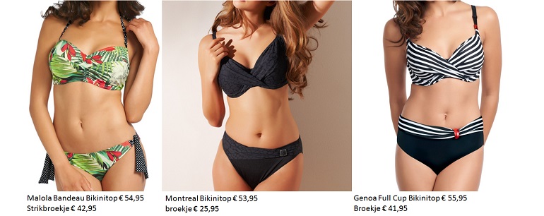 Je vindt in het assortiment grote cup maten de hipste en leukste bikini’s die je borsten een goede ondersteuning geven. Populaire merken waar je een leuke bikini kunt scoren zijn Cleo, Prima Donna, Fantasie, Freya, Seafolly, Panache en Miss Mandalay.